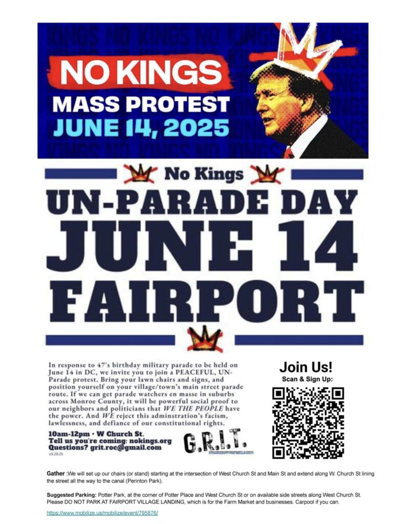 In June for NO KINGS on Trump’s birthday, we did something really huge. GRIT organized and marshaled protests in Fairport, Pittsford, Brighton, Henrietta and Irondequoit.